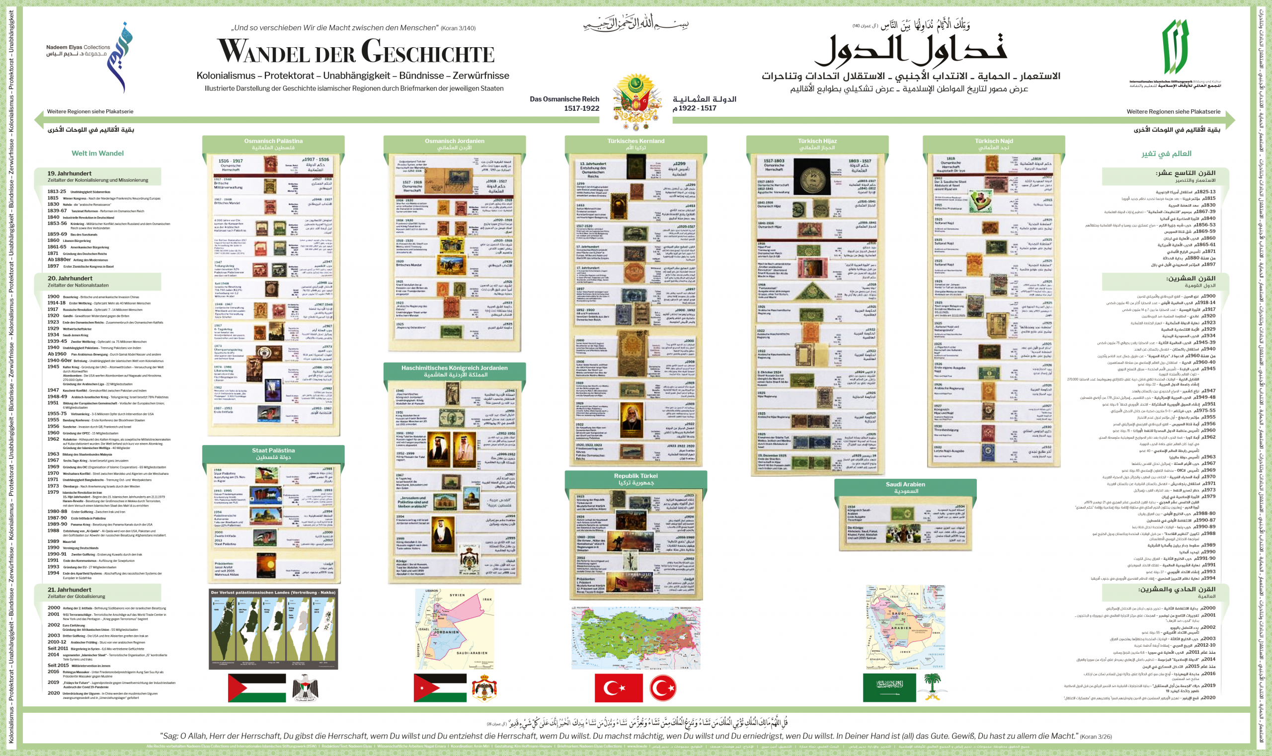Unsere exklusive Plakat-Reihe „Wandel der Geschichte“ veranschaulicht die komplexe politische Entwicklung der heutigen Staaten der islamischen Welt – eindrucksvoll illustriert durch originale Briefmarken und historische Dokumente.